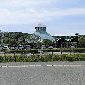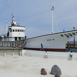 海の特産品が並ぶ市場があります。漁船のレプリカや、広い芝生広場があります。